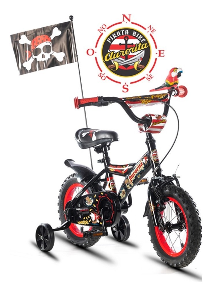 Bicicleta Aurora Rodado 12 Diseño Pirata Con Accesorios Negro Con Rojo