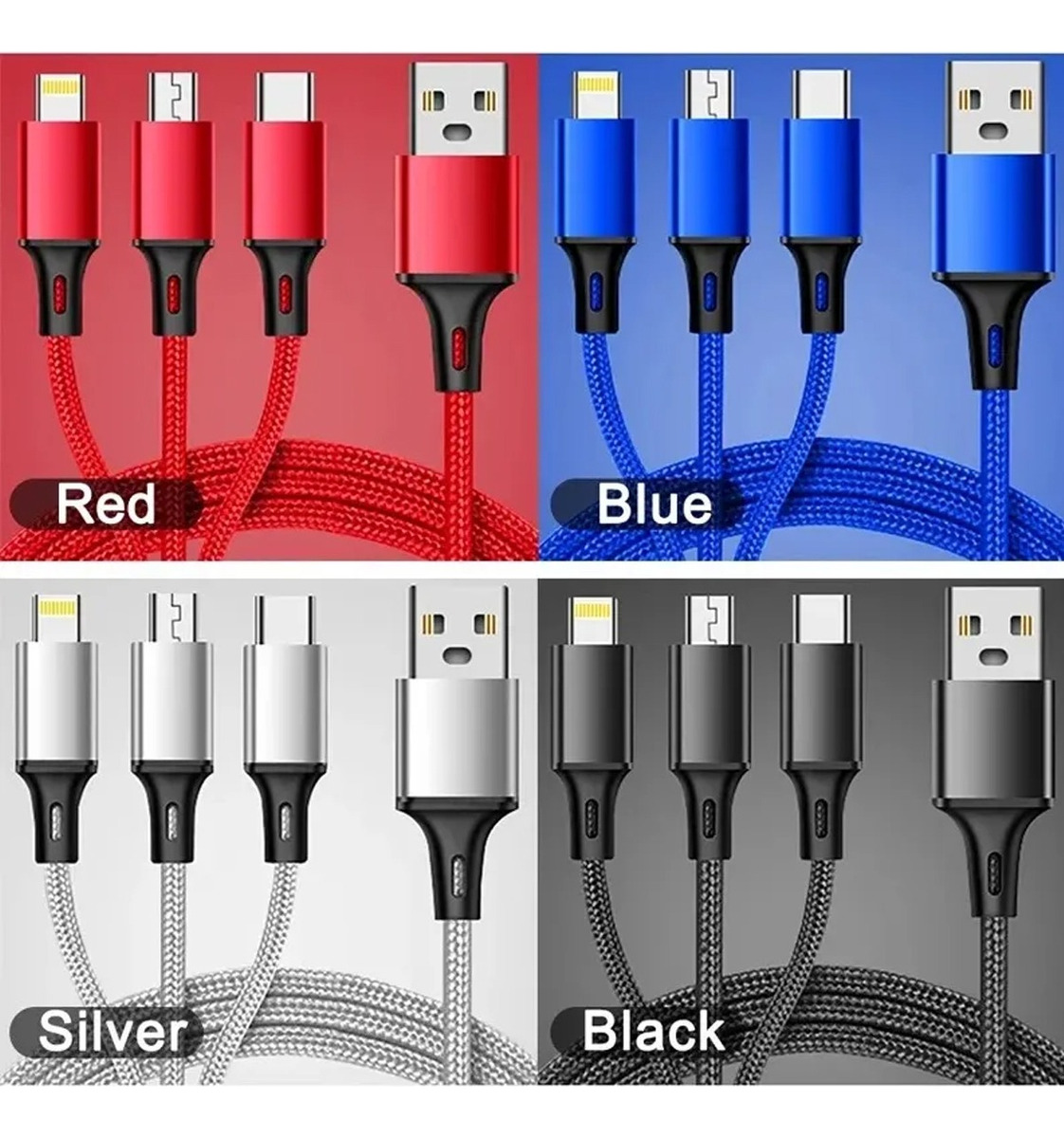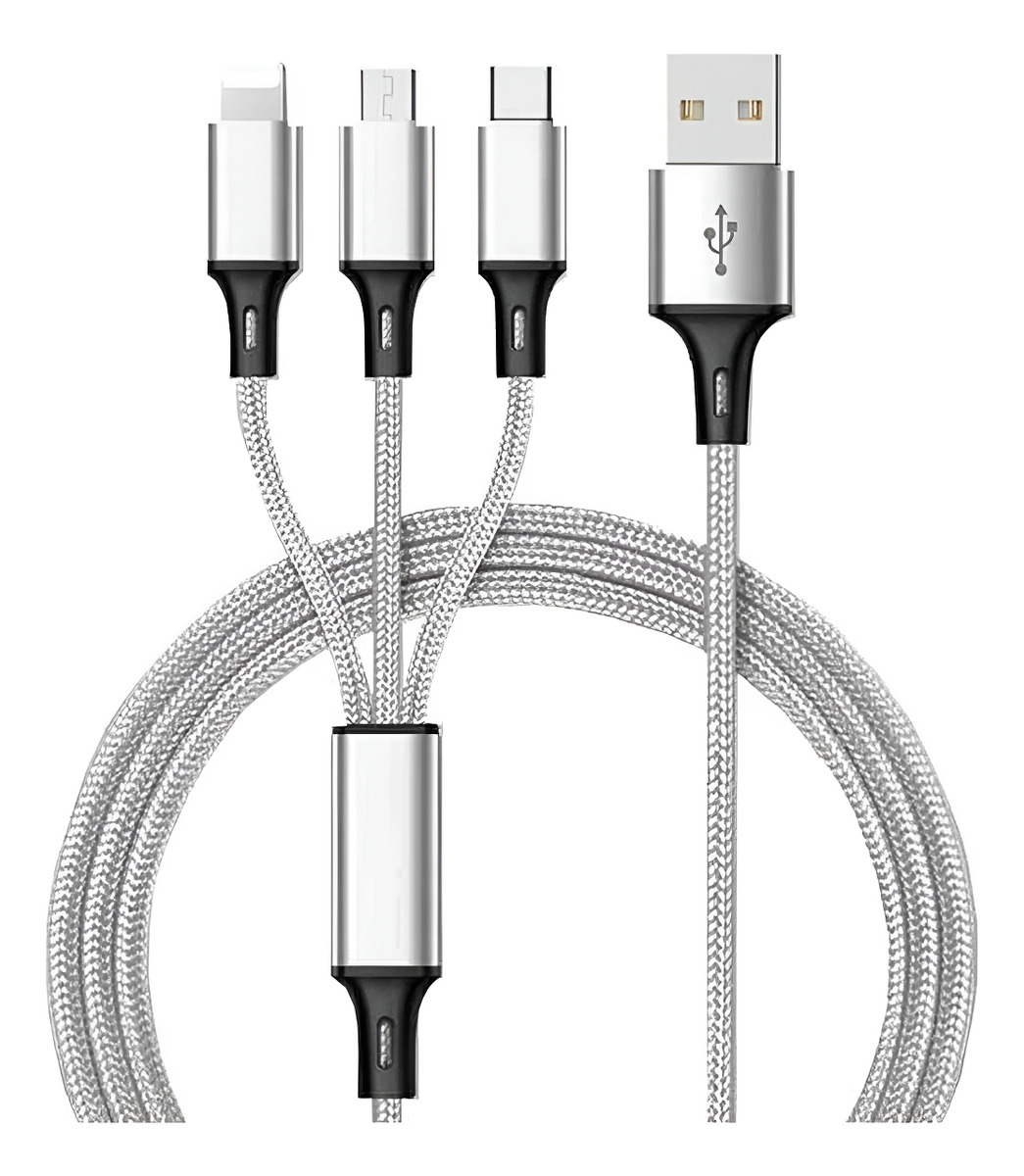 Cable De Carga Usb 3 En 1 Multificha Mallado Usb-C Micro Usb Lightining