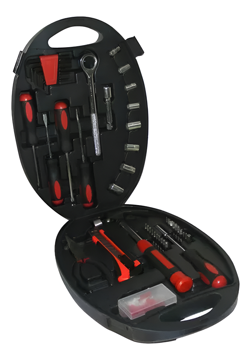 – Incluye: martillo, pinza larga, cuchillo utilitario, llave tubo, brocas, destornilladores, llave ajustable, llaves hexagonales en funda de plástico, sujetadores en una caja de plástico