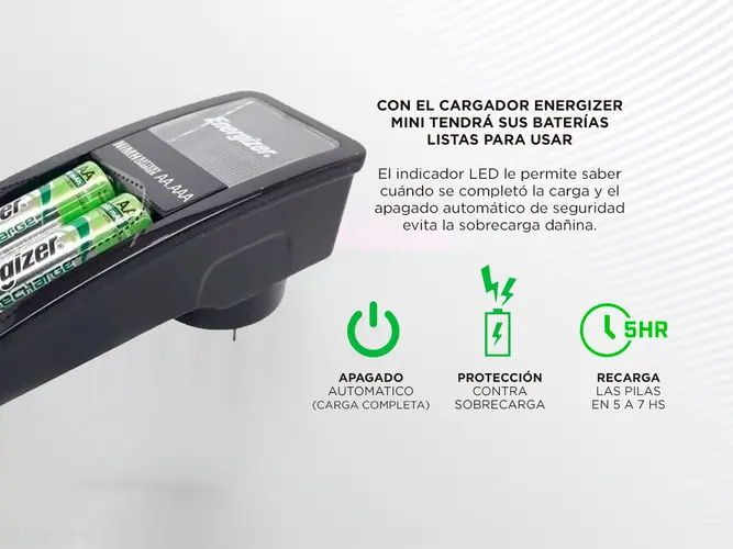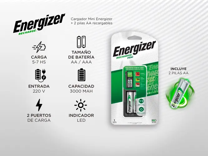 Cargador Mini Energizer + 2 Pilas Recargables de Ni-Mh Tamaño AA de 1.2V 1300mah de Regalo