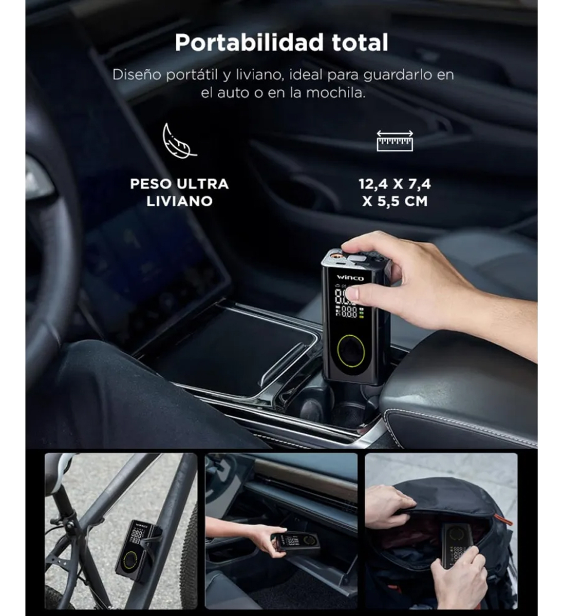– Ideal para viajes o emergencias, combina la practicidad de un cargador portátil con la potencia de un compresor de aire