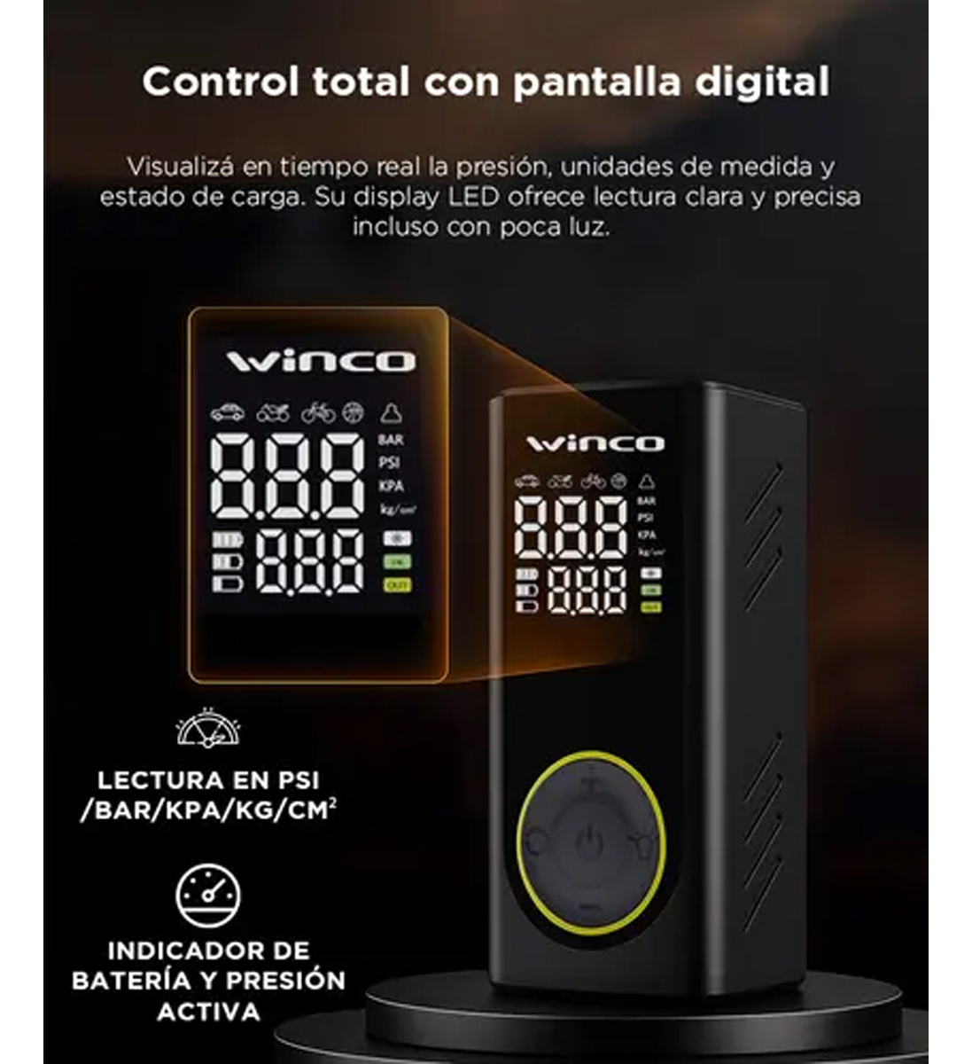 – El display digital muestra en tiempo real los valores de presión en PSI, BAR y KPA, asegurando una calibración exacta para cada tipo de neumático o artículo