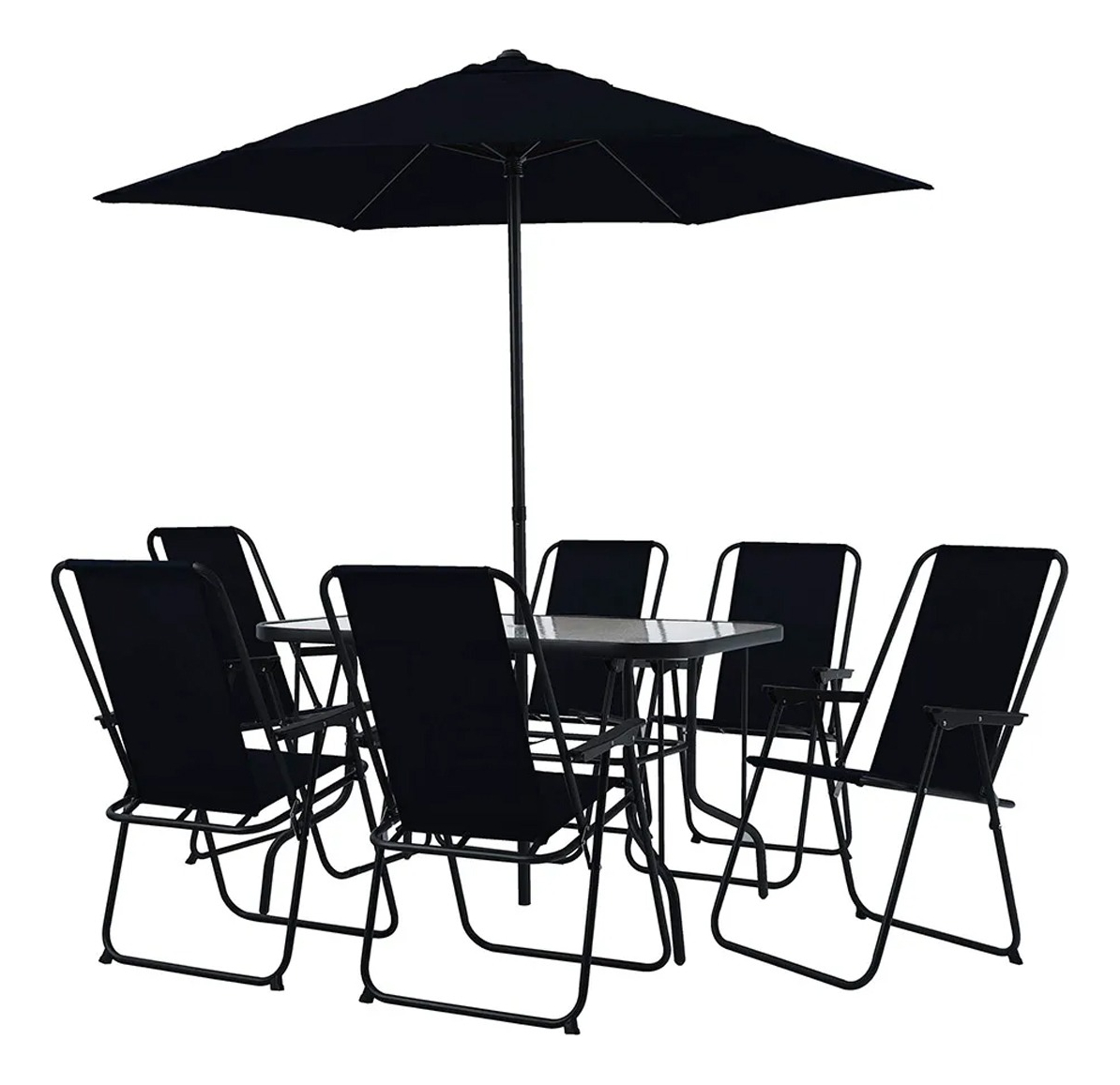 Set De Jardín 8 Piezas Mesa De Vidrio + 6 Sillas Reposera + Sombrilla