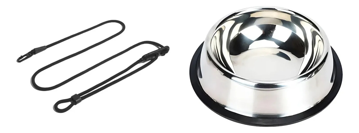 Correa soga para perro con longitud ajustable de 1,2 a 2,4 metros, fabricada con cuerda ultra resistente, con gancho de acero confiable y detalles en negro que combinan con diferentes estilos. Comedero y bebedero en acero inoxidable con capacidad de 350 ml, diámetro de base 18 cm y diámetro superior 13 cm, con diseño antideslizante para una alimentación limpia y segura.