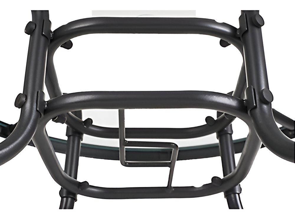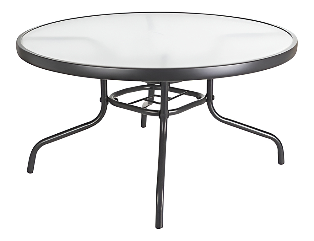 La mesa está construida con un resistente marco de acero y una superficie de vidrio templado, garantizando durabilidad y resistencia a las condiciones climáticas. El vidrio templado no solo es resistente, sino que también es fácil de limpiar, lo que hace que el mantenimiento de esta mesa sea un proceso sencillo.
