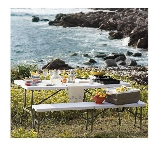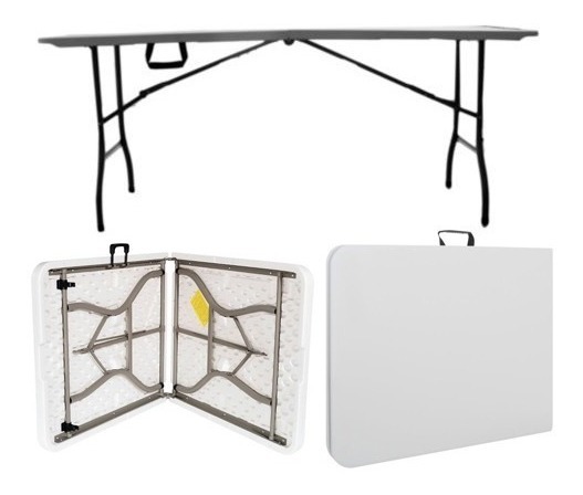 Para el camping o eventos al aire libre tienes a esta gran mesa plegable tipo maletin. Una práctica superficie con cubierta de plástico resistente y patas de metal. Fácil de limpiar y durable a las inclemencias del tiempo. Llévala adonde la necesites con comodidad y rapidez, ya que está diseñada para plegarse como una maleta. Ofrece suficiente espacio para acomodar a 6 personas.