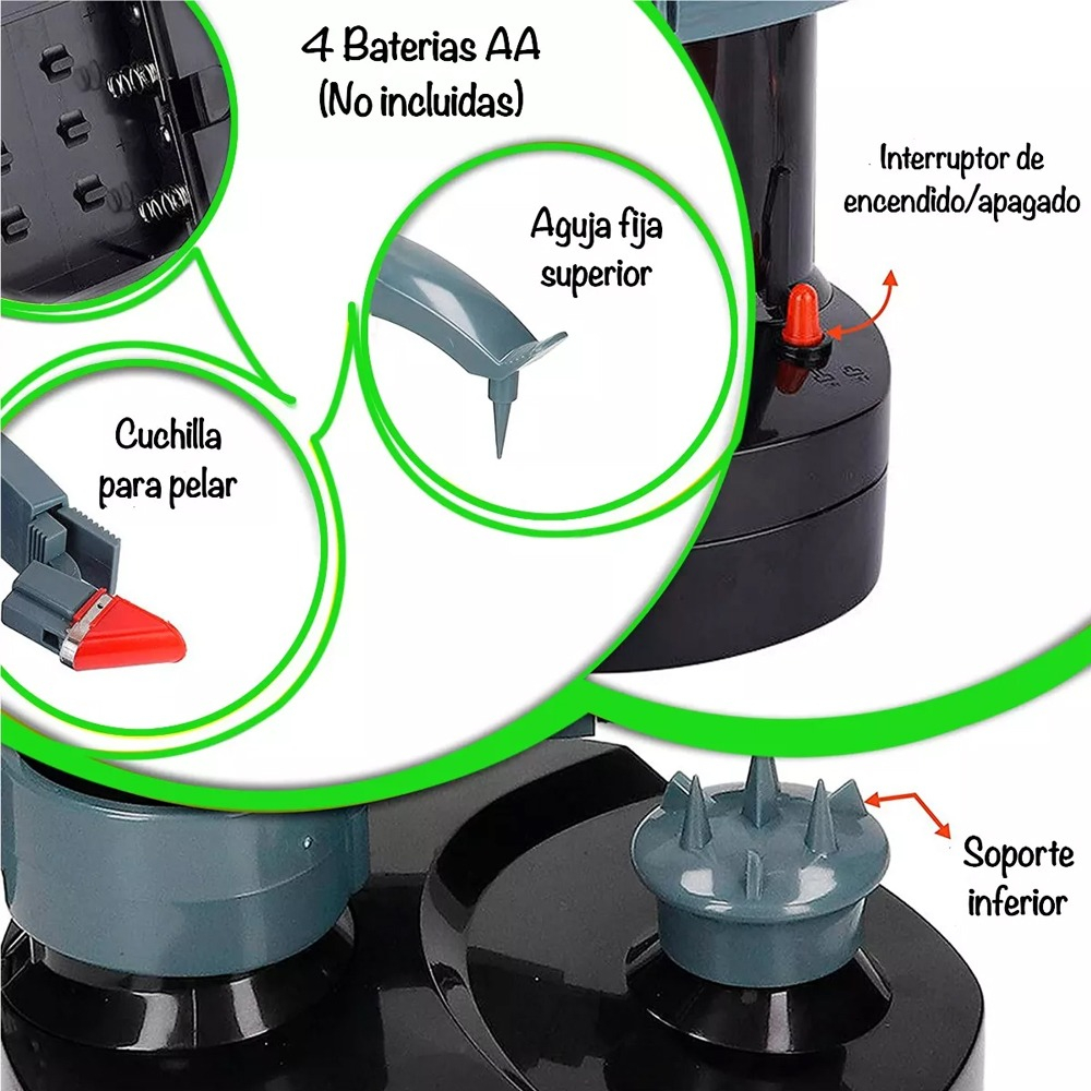 – Simplemente coloca la fruta o verdura en el soporte, enciende el pelador y observa cómo realiza todo el trabajo por ti en cuestión de segundos