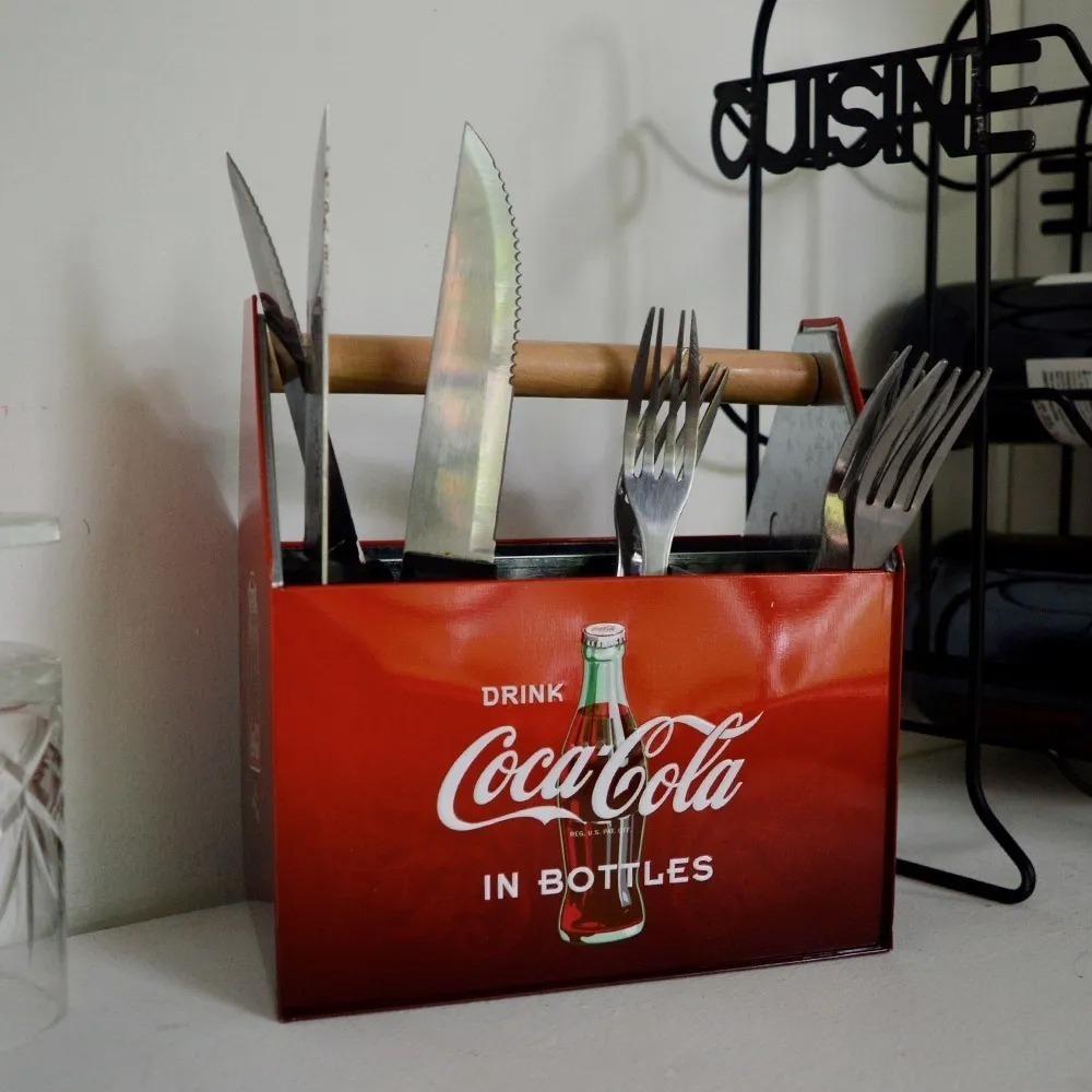 El porta cubiertos de estilo retro puede mantener los tenedores, cucharas, cuchillos y servilletas en posición vertical. Delicioso y refrescante logo de Coca Cola. ________________________________________________________________