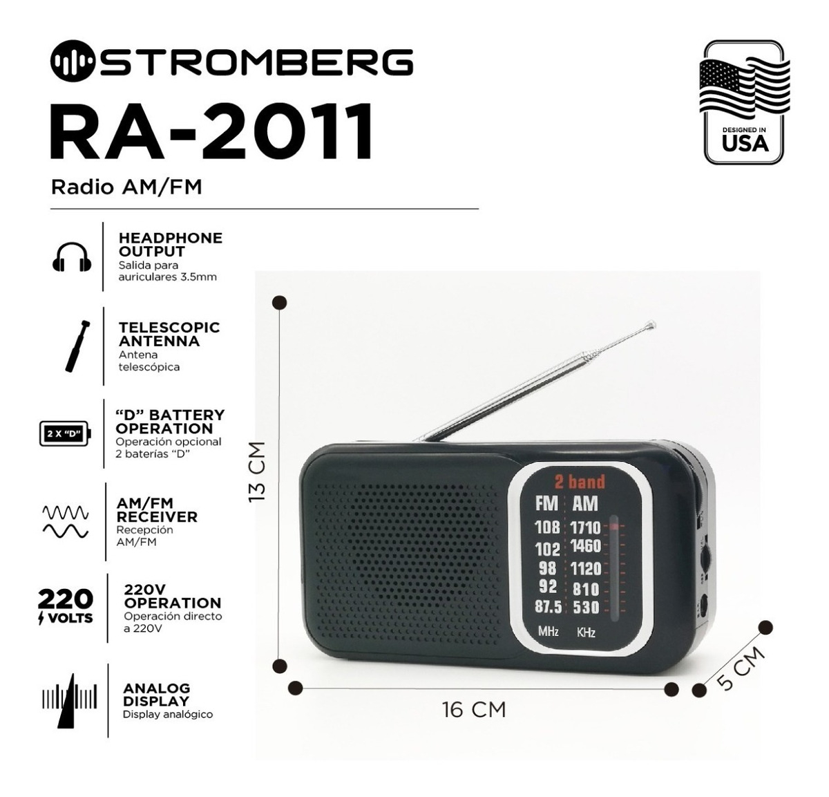 Descubre la Radio Portátil Analógica Stromberg, modelo RA2011, diseñada para ofrecerte una experiencia auditiva excepcional en cualquier lugar. Con su sintonizador analógico, podrás disfrutar de tus estaciones AM y FM favoritas con facilidad. Este dispositivo cuenta con un parlante incorporado que garantiza un sonido claro y envolvente. Su antena telescópica optimiza la recepción de señales, permitiéndote sintonizar incluso las estaciones más distantes. Además, incluye una salida para auriculares, ideal para momentos de privacidad. Funciona con 2 pilas tipo D (no incluidas) y también puedes conectarla a la corriente con el cable incluido. Su diseño portátil y ligero, con una profundidad de solo 5 cm, la convierte en la compañera perfecta para tus aventuras al aire libre. Aunque no es resistente al agua, su condición de nuevo asegura que disfrutarás de un producto de calidad. ¡No te quedes sin la tuya!