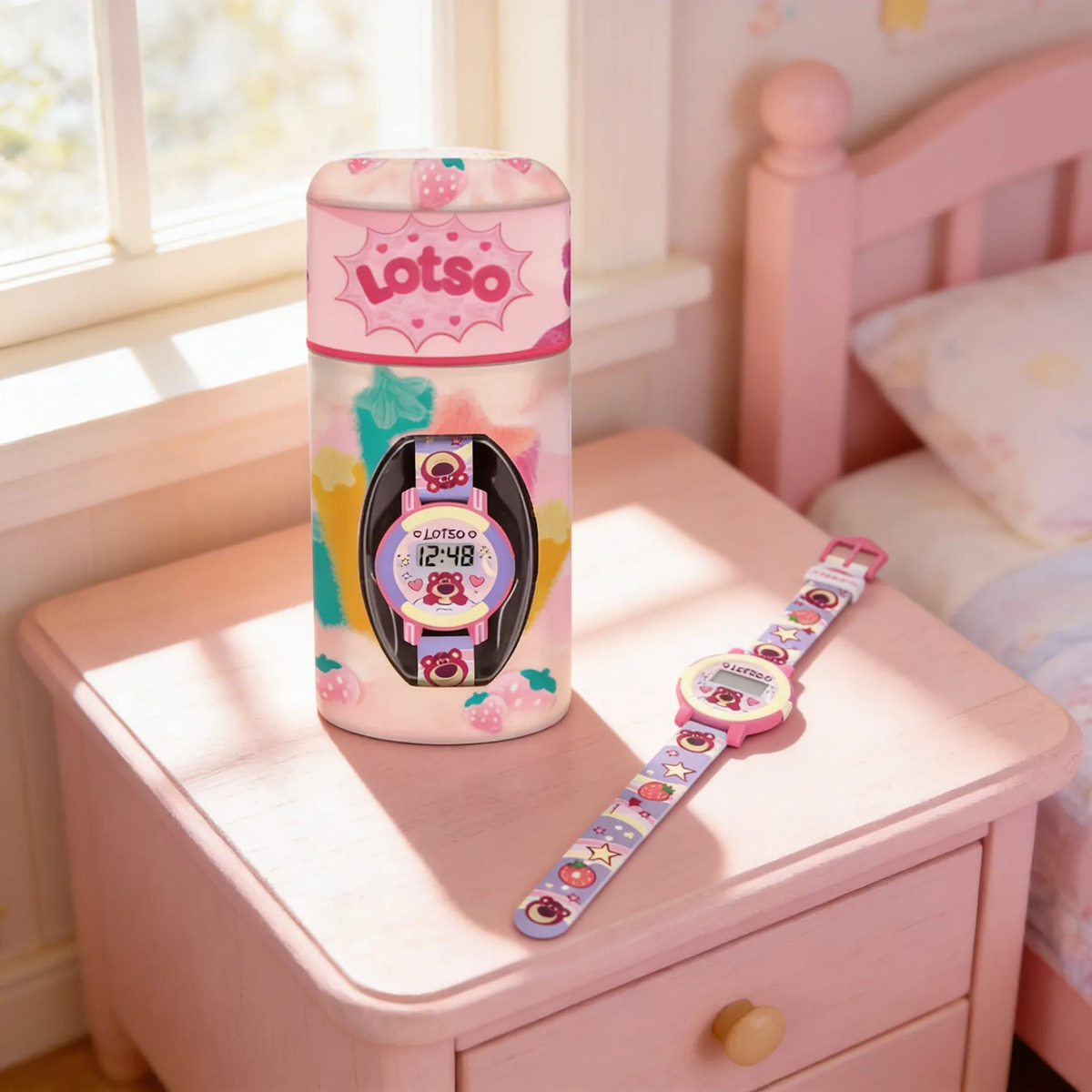 -Este práctico y divertido combo de reloj digital + alcancía con diseño de Lotso combina aprendizaje, entretenimiento y funcionalidad en un solo producto.