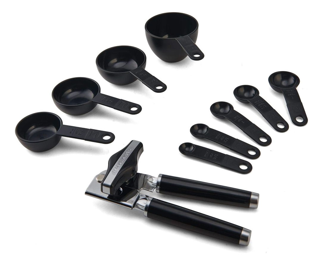 – Incluye: Girador ranurado, Cuchara para untar, espátula raspadora, pelador europeo, abrelatas multifunción, batidor utilitario, juego de 4 tazas medidoras (1 taza, 1/2 taza, 1/3 taza y 1/4 taza), y juego de 5 cucharadas medidoras (1 cucharada, 1/2 cucharada, 1 cucharadita, 1/2 cucharadita y 1/4 cucharadita).