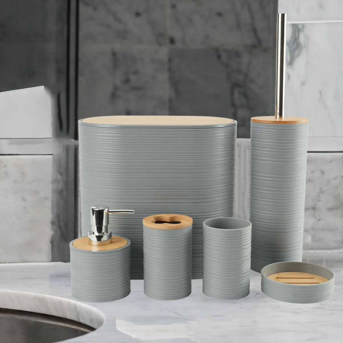 Set De Baño X6 Piezas Wooden Plástico Y Bambú