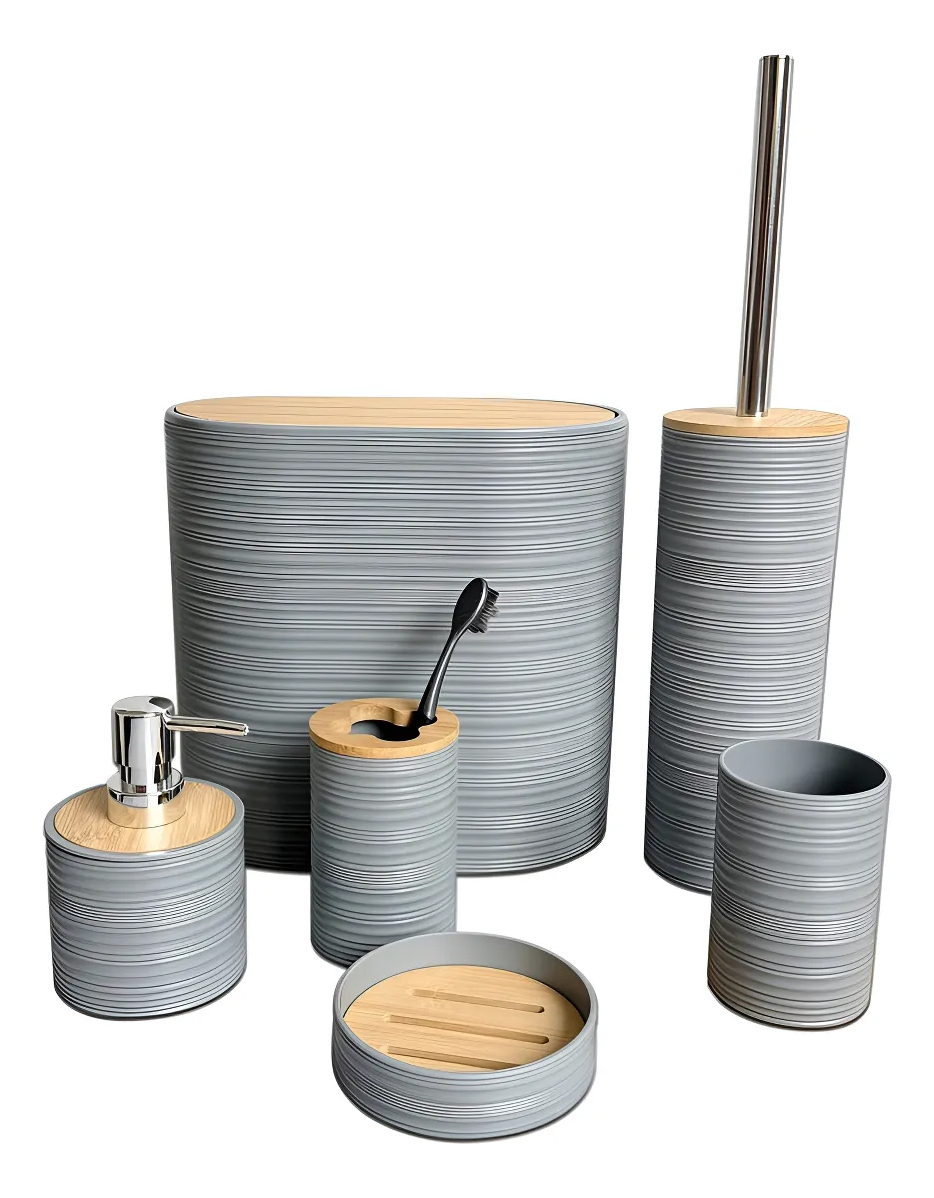 Set Accesorios Baño X6 Plastico Bambu Cepillo Cesto Premium