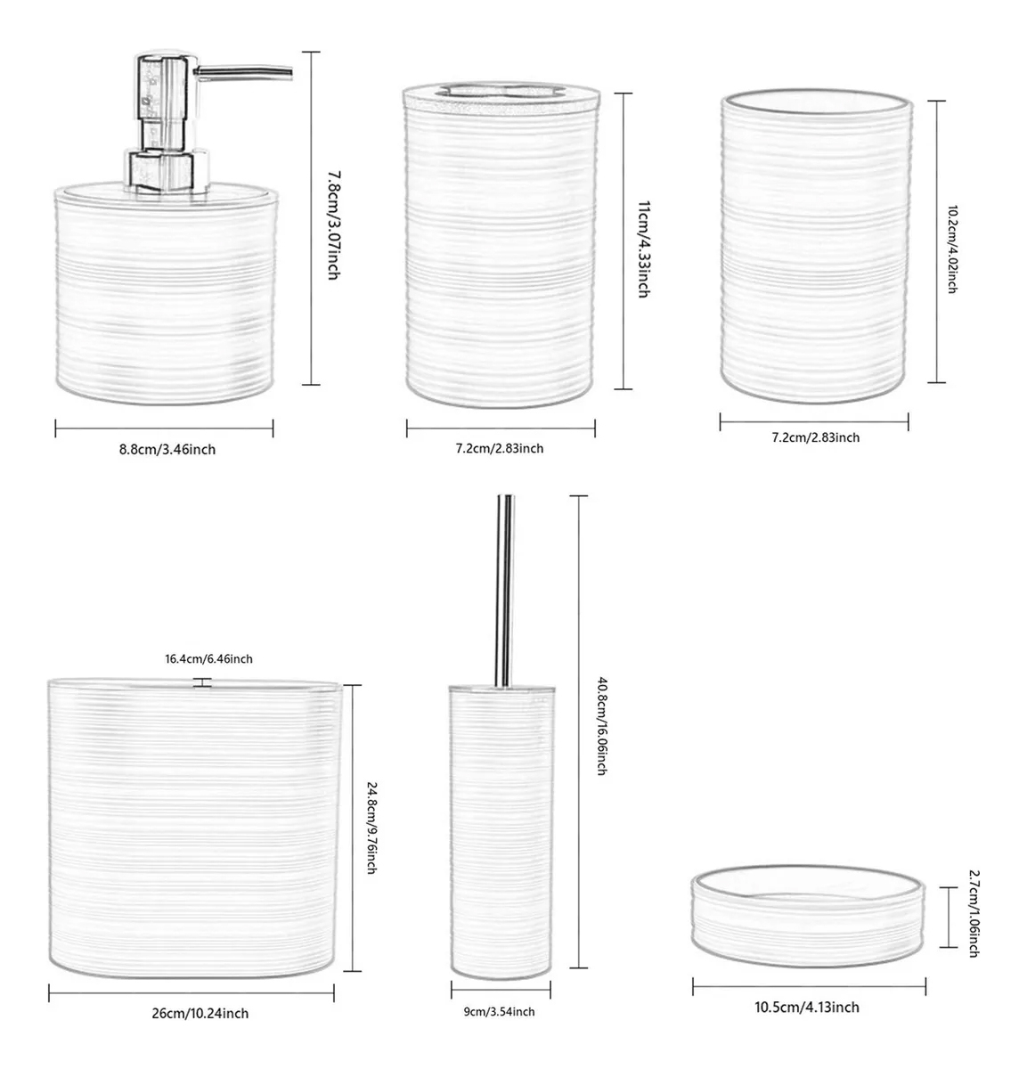 – Colección de accesorios de baño de 6 piezas que incluye papelera, vaso, dispensador de jabón, portacepillos de dientes, escobilla de inodoro y jabonera en elegante acabado blanco