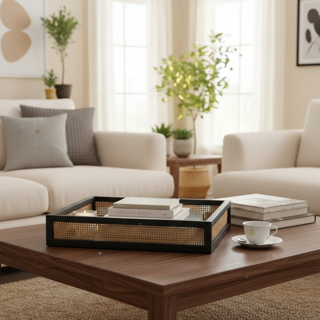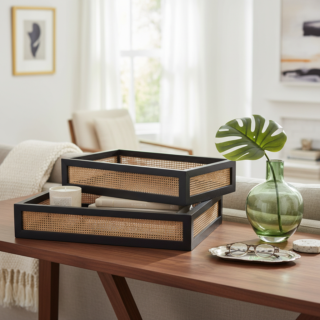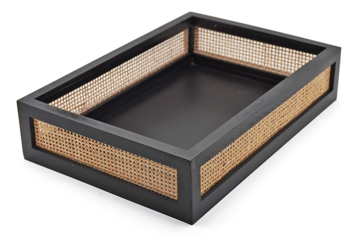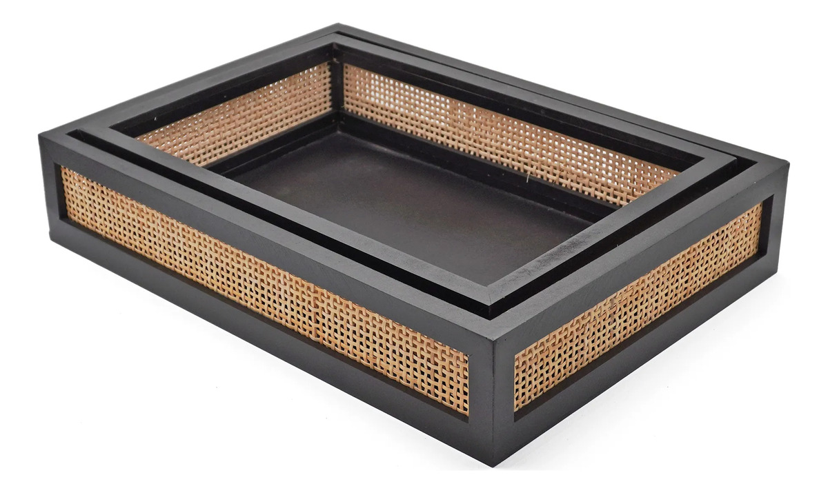 Set Bandeja Organizador Madera Y Ratan Calidad Premium