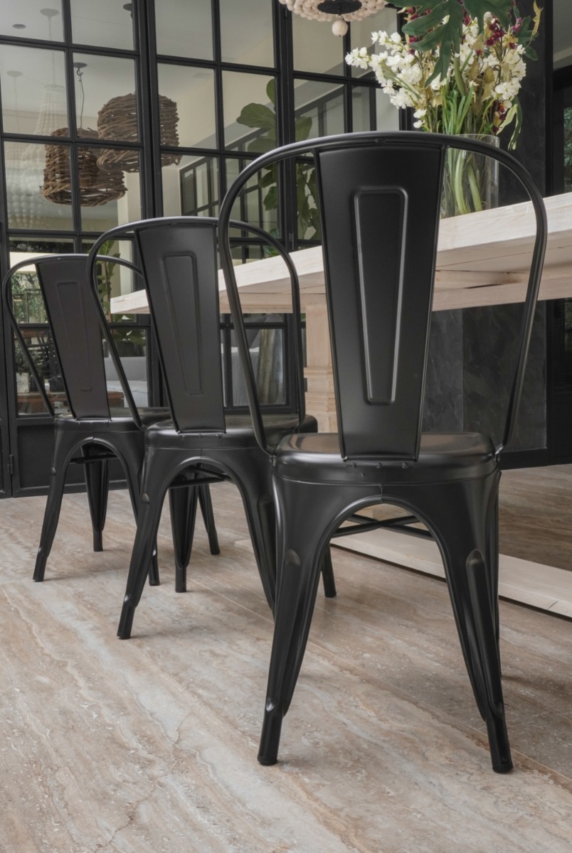 Silla de diseño industrial Tolix, es un básico de la decoración, gracias a su versatilidad y estilo minimalista puede integrarse a diferentes ambientes, se puede elegir en un solo color o combinar varios colores para conseguir un conjunto mas dinámico y original. Es apilable y al ser de acero resiste perfectamente un uso frecuente.