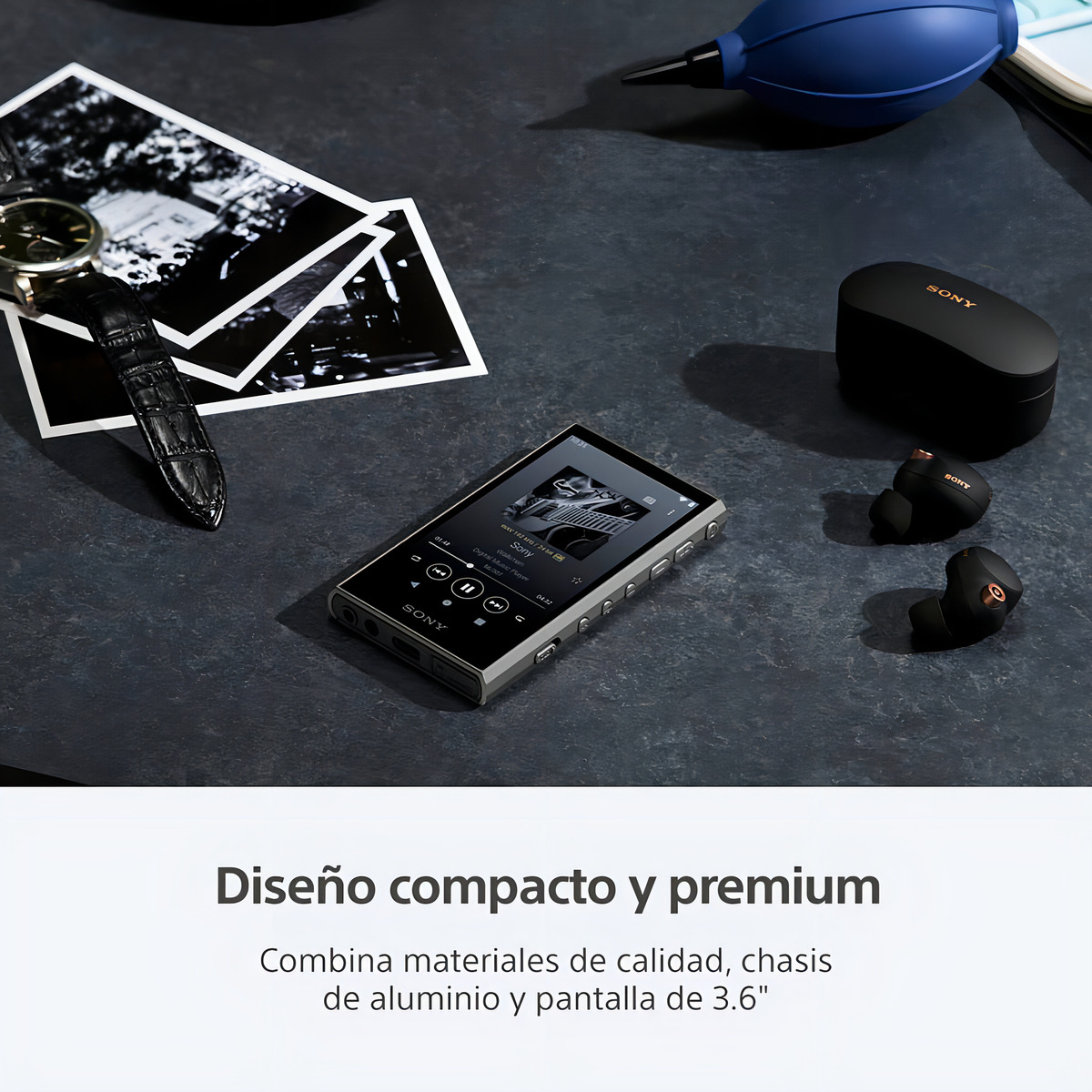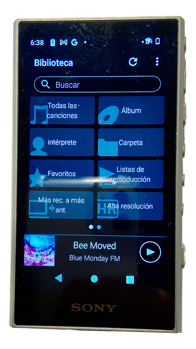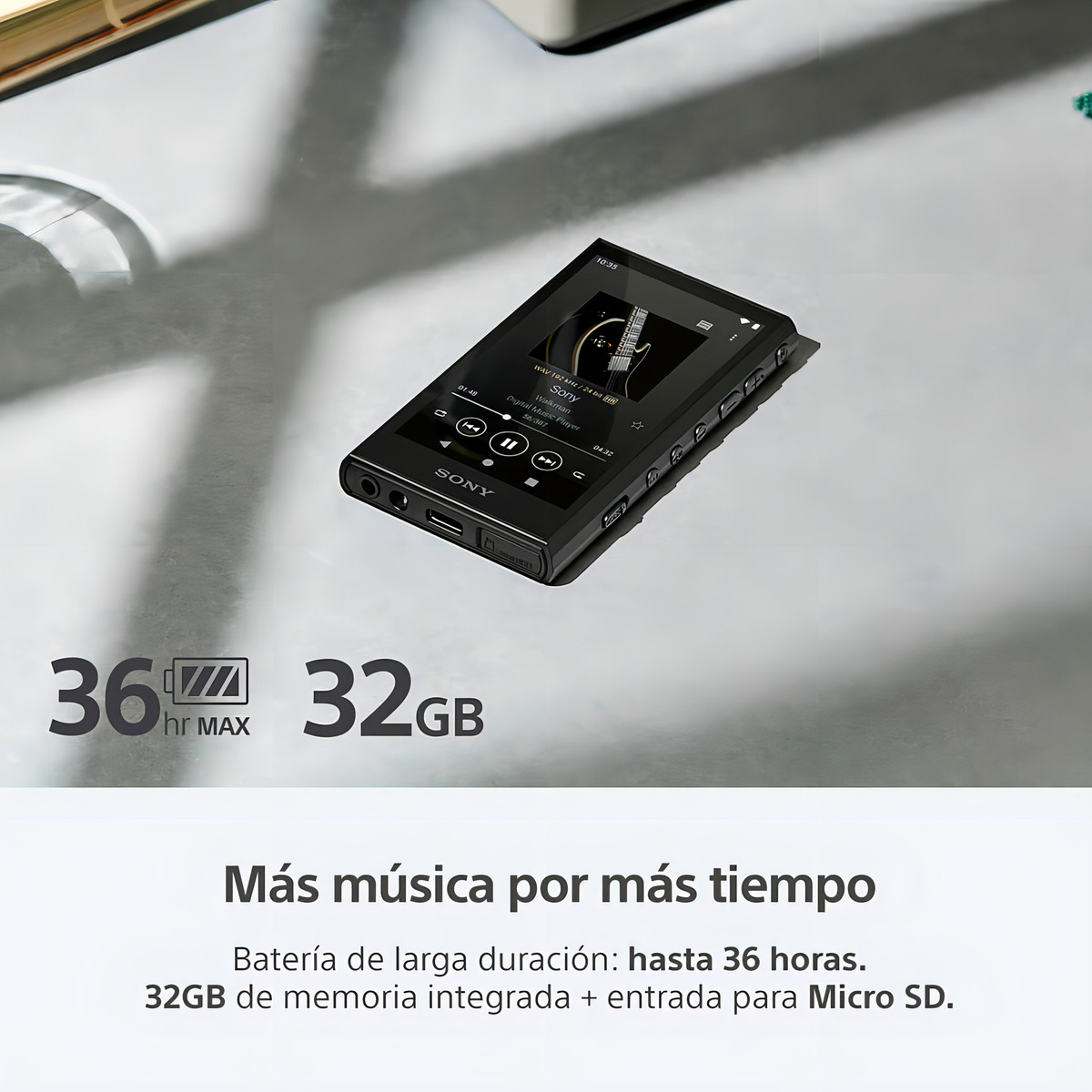 Compatible con audio de alta resolución, con Wi-Fi para descarga y transmisión, memoria integrada de 32 GB y ranura para tarjetas SD.