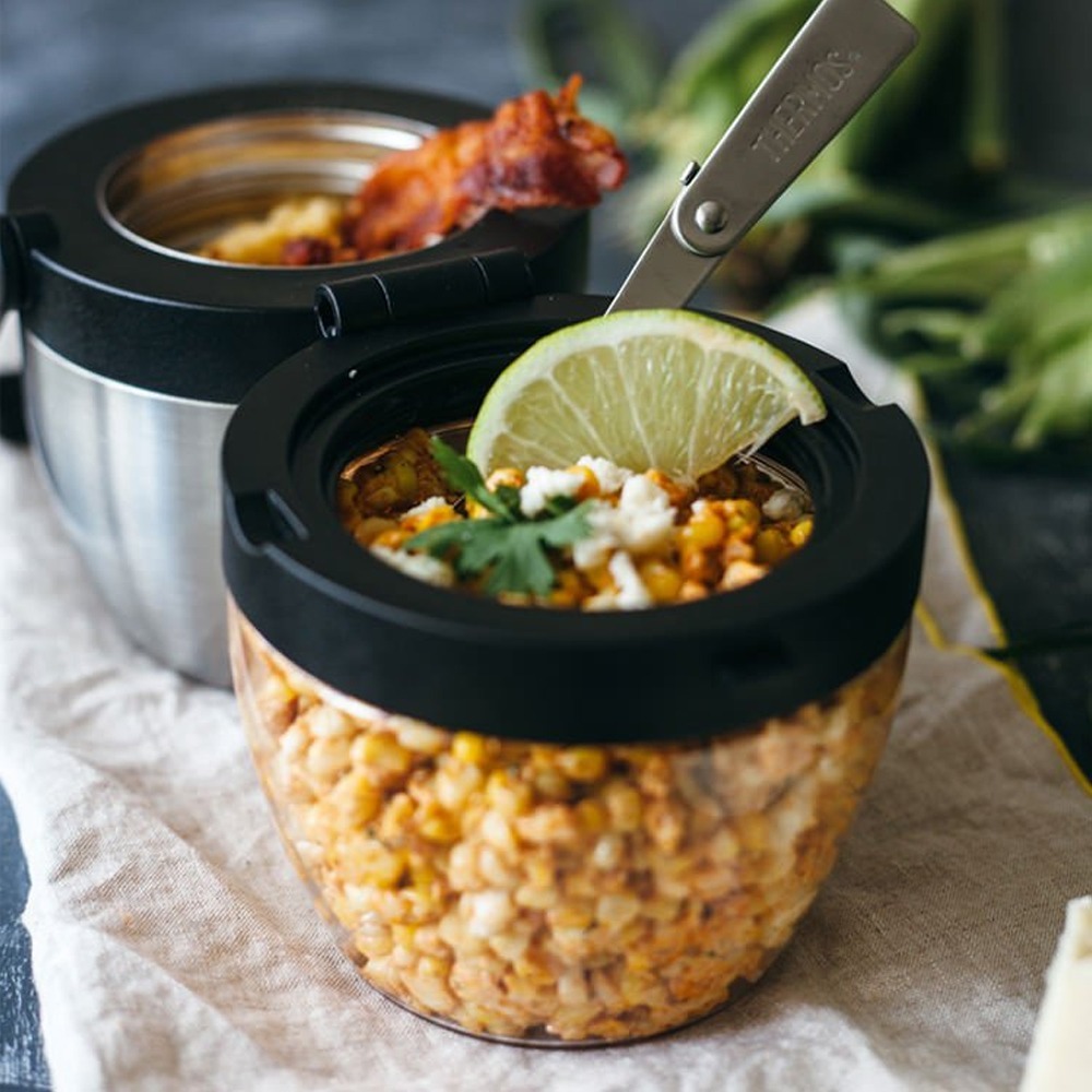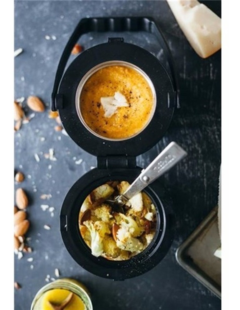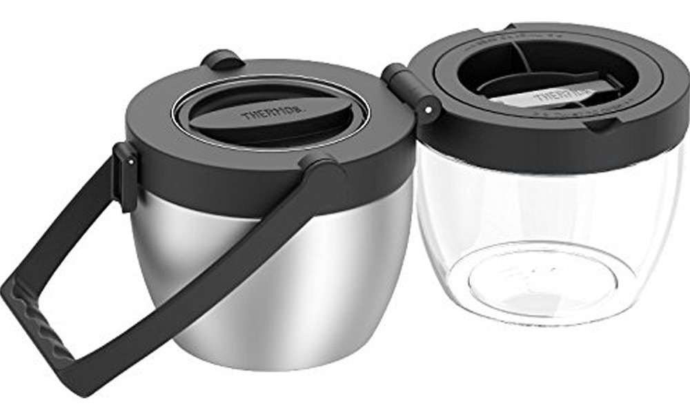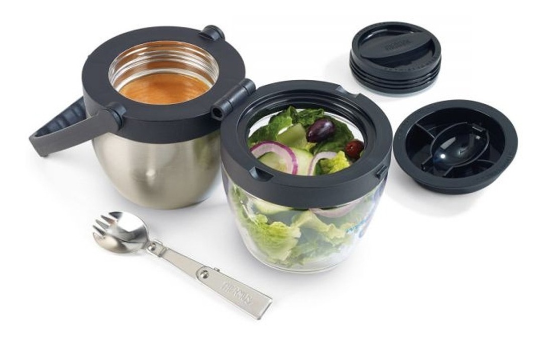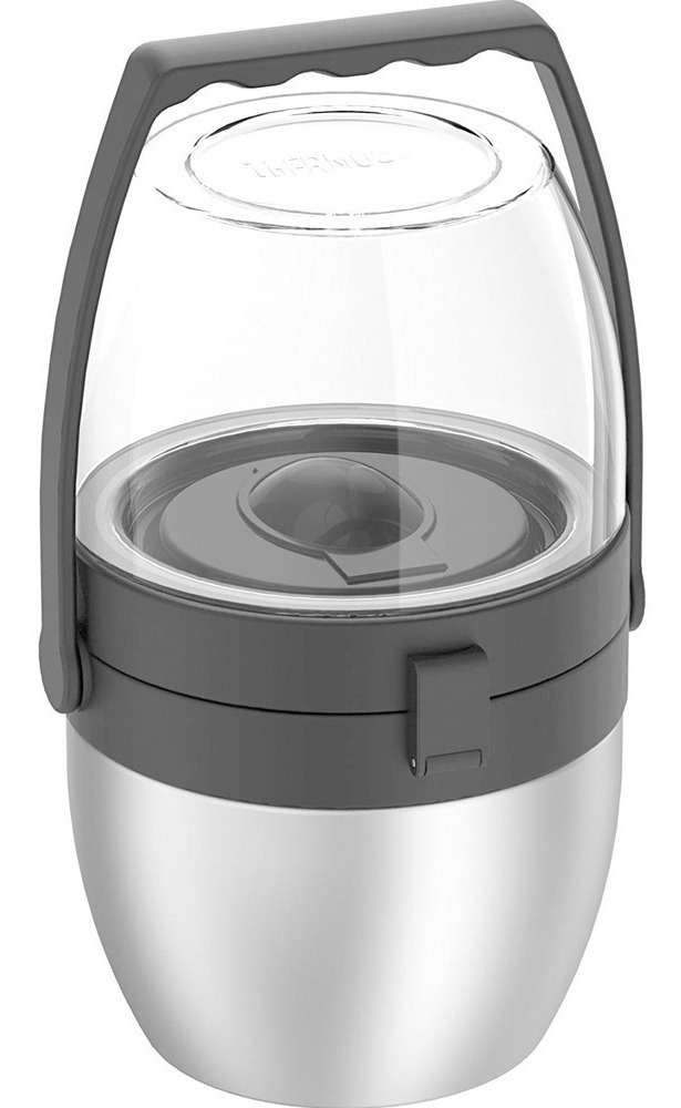 El frasco de alimentos de doble compartimiento de la marca Thermos es el contenedor de almacenamiento de alimentos reutilizable más nuevo e innovador del mercado. Dos compartimentos separados con bisagras hacen infinitas combinaciones para disfrutar de las comidas. Es el diseño ideal para almacenar sopa caliente en el compartimiento de acero inoxidable de 473 ml, y una ensalada fresca y refrescante en el compartimiento de Eastman Tritan sin BPA de 591 ml. La tecnología de aislamiento térmico al vacío mantiene el contenido en el compartimiento de acero inoxidable caliente por 5 horas o frío por 7, y los alimentos calientes se mantendrán calientes incluso cuando el frasco de alimentos se almacena en un refrigerador. De tamaño compacto, este frasco para alimentos cuenta con un asa de transporte integrada para un fácil transporte. Como beneficio adicional, el frasco para alimentos viene equipado con un tenedor plegable de acero inoxidable de tamaño completo que cabe dentro de la tapa, lo que elimina la necesidad de empacar utensilios separados.